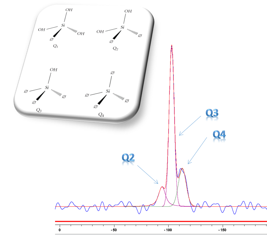 Déconvolution du spectre 29Si d’un matériau silicique permettant de distinguer les sites suivant le nombre d’atomes d’oxygène liés (eux-mêmes liés ou non à d’autre silicium).