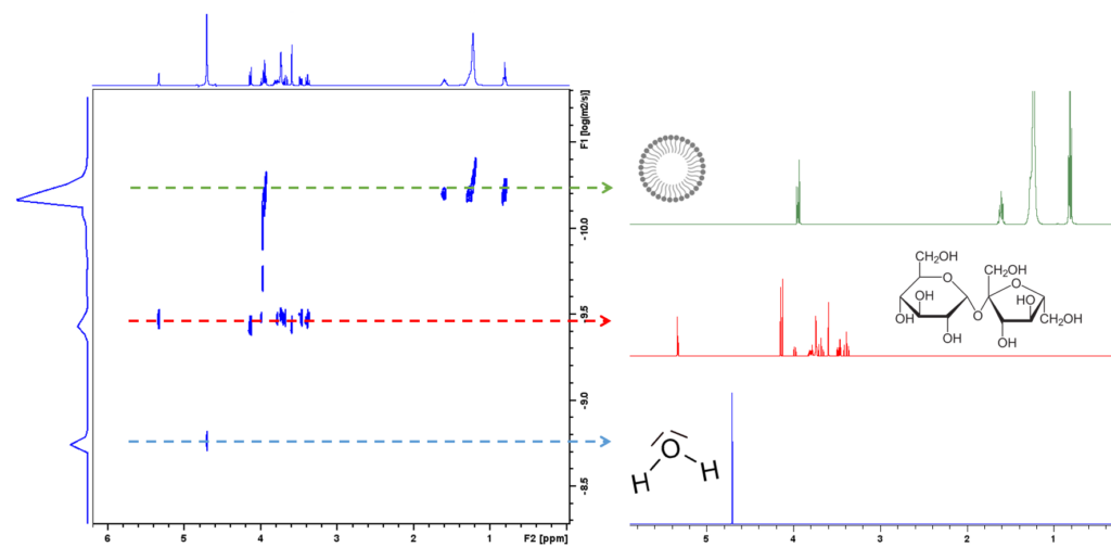 Séparation analytique d’un mélange de composés en fonction de leurs coefficients de diffusion. Mélange composé de micelles de SDS, sucrose et eau.