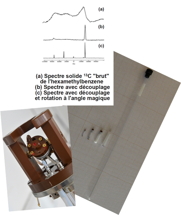 En RMN des solides, la structure à échelle atomique de différents matériaux peut être étudiée. Les techniques de polarisation croisée avec rotation de l’échantillon à l’angle magique CP-MAS sont proposées sur les deux appareils de la plateforme, à 300MHz et 600MHz (fréquence de résonance du 1H). Des méthodes mono- ou bi-dimensionnelles peuvent être utilisées.