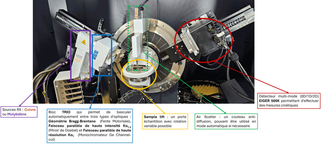 Possibilité d’installer un porte capillaire rotatif afin d’effectuer des mesures en transmission sur des capillaires ainsi que des mesures permettant l’analyse par fonction de distribution de paires (pair distribution function – pdf).