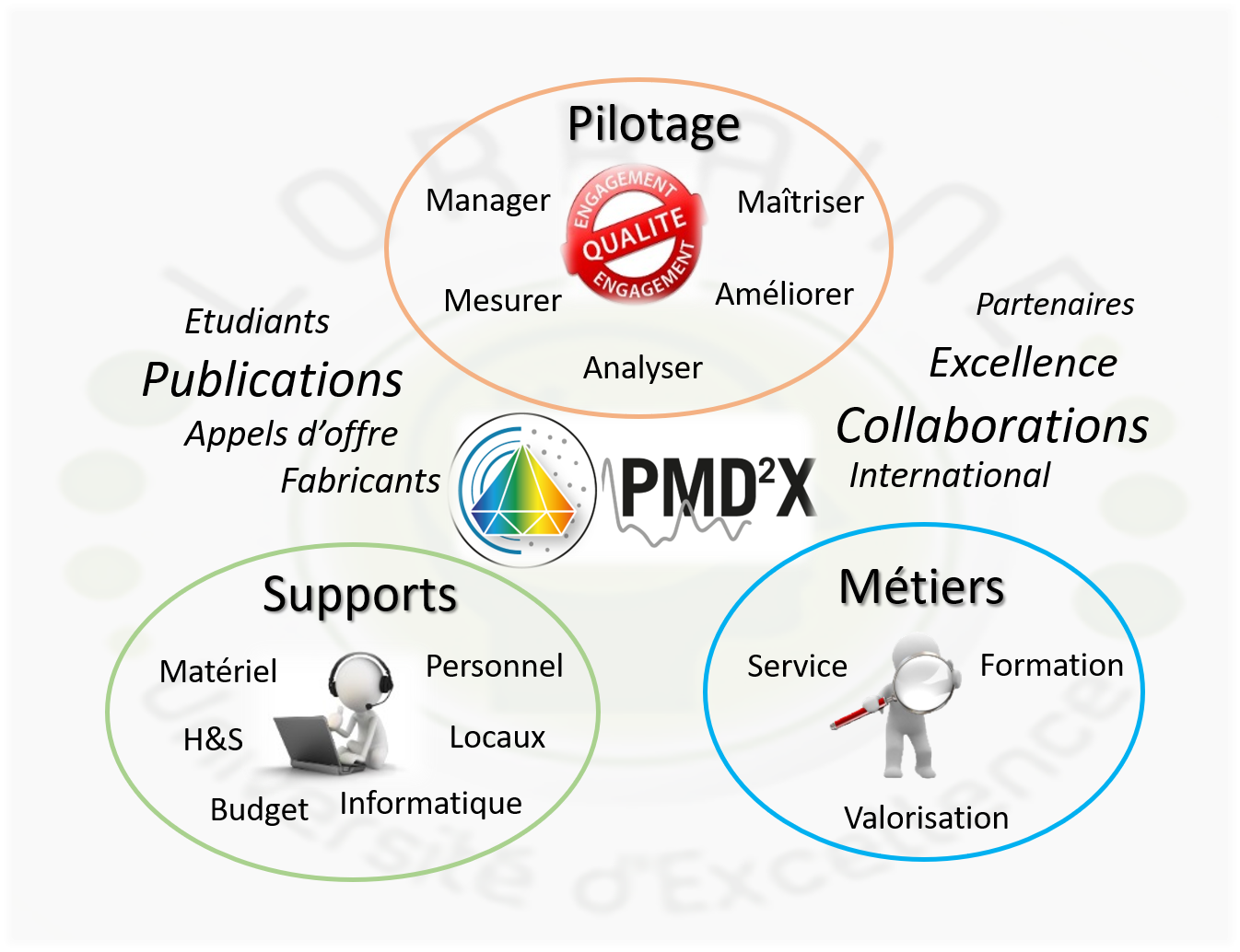 Notre principal objectif est d’être à l’écoute des besoins et attentes de nos utilisateurs et collaborateurs pour leur apporter la meilleure satisfaction possible. Dans ce contexte, la PMD²X a mis en place un Système de Management de la Qualité (SMQ) suivant le référentiel INFRA+ afin d’obtenir la labélisation « StAR-LUE : Structure d’Appui à la Recherche de Lorraine Université d’Excellence ». Cette démarche consiste en la définition de l’activité de la plateforme, de son fonctionnement et ses axes de développements, et de sa politique de qualité et de communication. Avec l’accompagnement de la Délégation à l’Aide au Pilotage Et à la Qualité (DAPEQ) de l’Université de Lorraine, nous avons mis en place un ensemble de procédures afin de contrôler et de vérifier la conformité de nos mesures, analyses et prestations. A travers cette démarche nous avons identifié les processus nécessaires à notre SMQ. Nous avons déterminé les séquences et les interactions de ces processus. Nous avons également analysé l’efficacité des différentes démarches relatives au développement de la PMD²X. Ainsi, nous pourrons évaluer, ajuster et mettre à jour régulièrement le SMQ afin de maintenir le niveau d’excellence scientifique de notre plateforme, d’accroitre sa visibilité et de satisfaire les exigences de nos partenaires.