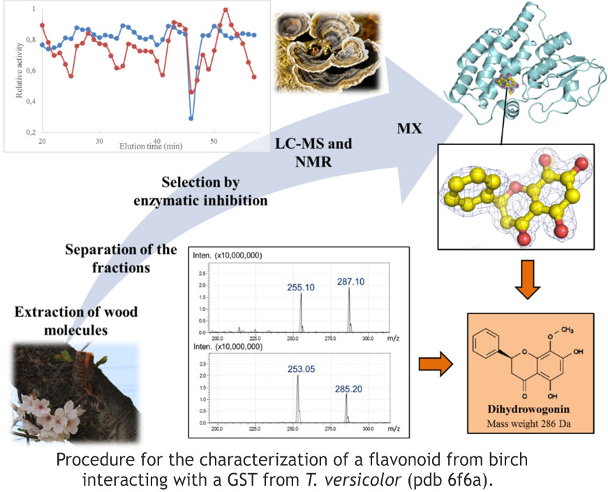 Wood-degrading fungi such as T. versicolor possess complex detoxification systems that allow them to cope with specialized metabolites produced by plants. Although the number of genes encoding GSTs is particularly high in these fungal organisms, little information is available on their target molecules. By combining biochemical, enzymatic and structural approaches, interactions between polyphenols and GSTs of T. versicolor have been demonstrated. To carry out this study, we set up original experimental protocols to obtain the crystallographic structures of complexes between GSTs and polyphenols (iii). In particular, affinity crystallography coupled with spectroscopic data (figure) allowed the identification of a flavonoid from cherry tree as a ligand of T. versicolor GSTs involved in the mineralization of this species (iv). In addition, a systematic review showed agreement between solution interaction data and crystallographic structures of the TvGSTO3S isoform in complex with a variety of hydroxybenzophenones. To quantify this agreement, crystallographic methods developed in the “Modelling” theme of the team, in particular the Charger algorithm, allowed the evaluation of the electrostatic interaction energies of each of the ligands, which are found to be well correlated with the affinities obtained in solution (v). Of course, this approach relies on obtaining crystallographic structures of protein-ligand complexes. Sometimes it remains a difficult step, for instance in the case of complexes between plant GSTs and antocyanins, which form an important class of relatively unstable, water-soluble pigments (vi). Several studies report a role for plant GSTs in their transport into the vacuole. More recently, we have been able to demonstrate an interaction of plant GSTs with several other less water-soluble but more stable classes of flavonoids. A decade ago, GST interactions with flavonoids were suggested; we have now succeeded in characterizing them from a structural point of view. Interestingly, recent studies by our collaborators in Dijon on human GSTs corroborate our results. Thus, plant flavonoids which belong to the human diet and are considered beneficial to health, are probably linked to these GSTs whose exact role remains to be clarified.