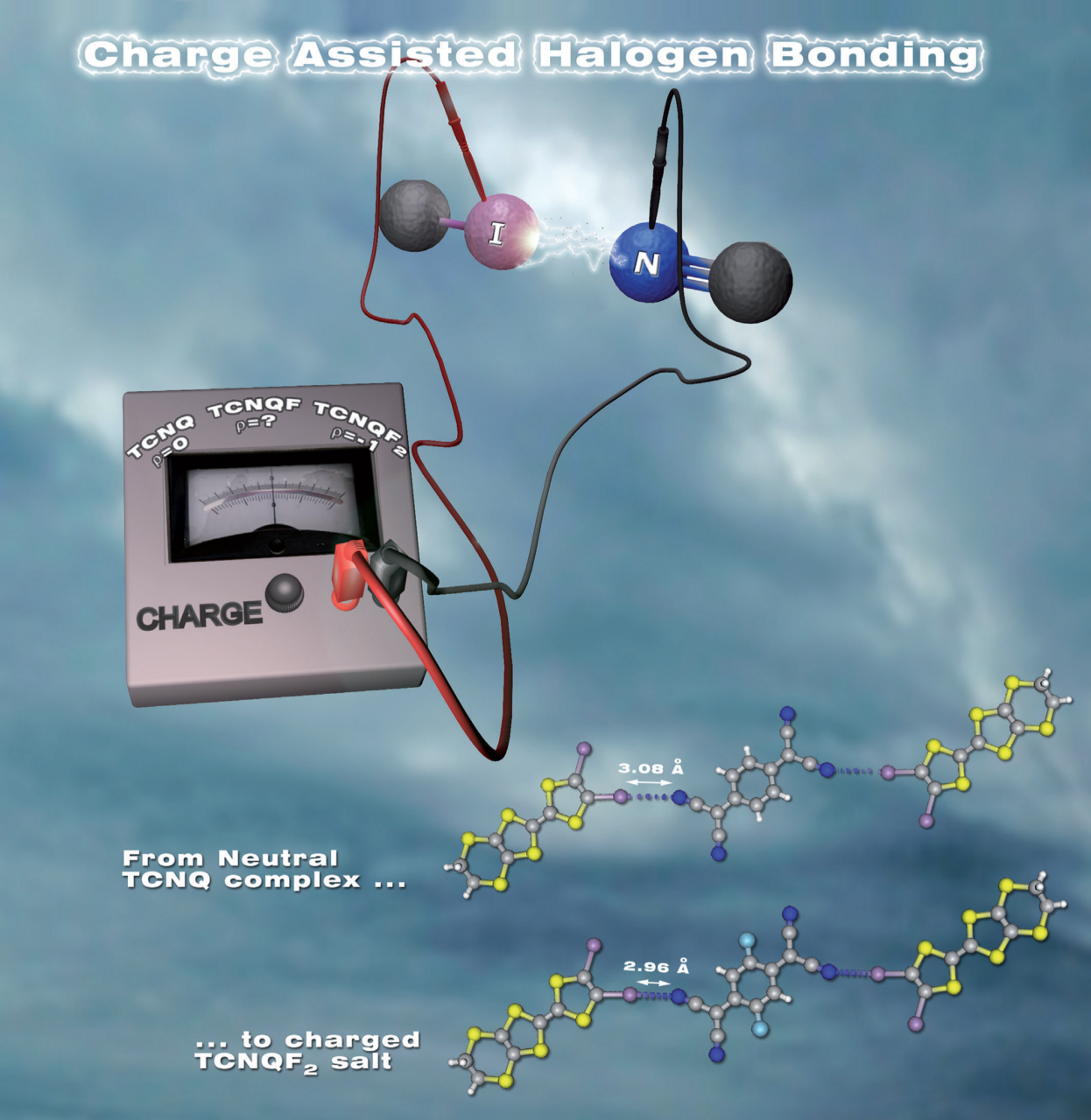 This effect can be essential for the modification of the original nature of the interaction, allowing a molecular system to migrate from a neutral towards an anionic state. Whereas, in this context, the transfer of a proton is involved in acid-base reactions taking place in molecular solids, this study shows for the first time that the same effect can be achieved with the transfer of a halogen atom.